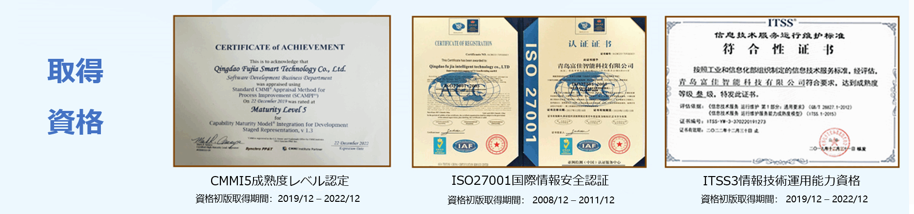 青島富佳智能科技有限公司(Fujias)は青島本土に立腳して、日本向けアウトソーシングソフトウェア開発サービスを提供して17年になりました。青島市アウトソーシングサービス協會を設立した會社の一つであります。青島市で初めてISO27001 國際情報セキュリティ資格認証を取得した企業です。CMMI3、CMMI5、ISO9000、ITSS3など國際國內資格認証を取得しました。